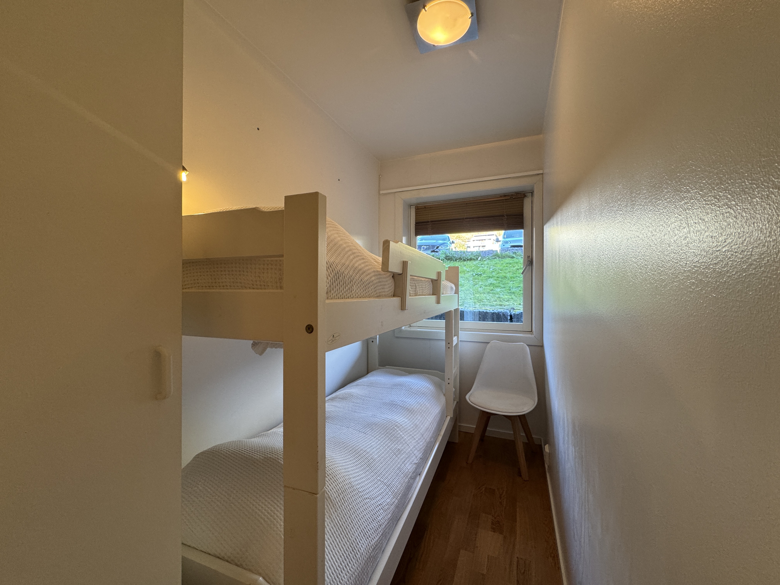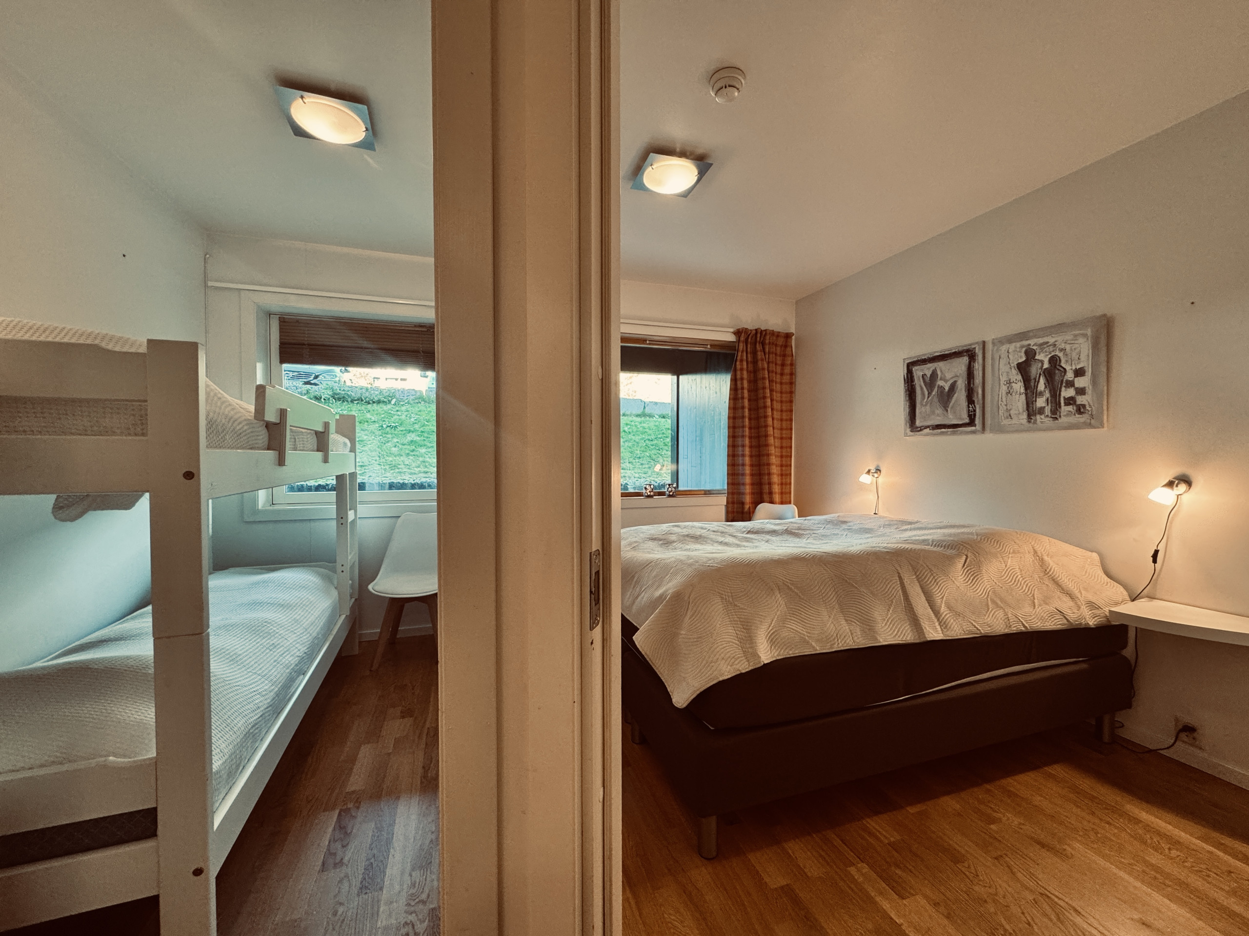 - 2 bedrooms (one with a double bed 150x200 cm, one with bunk beds 75x200 cm)