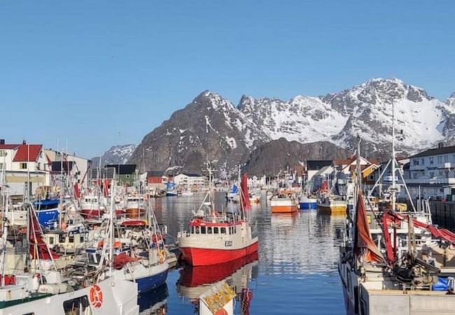 Wake up to the view of the local fishing boats heading out for the days catch, with the magnificent mountain ranges of Lofoten in the distance.