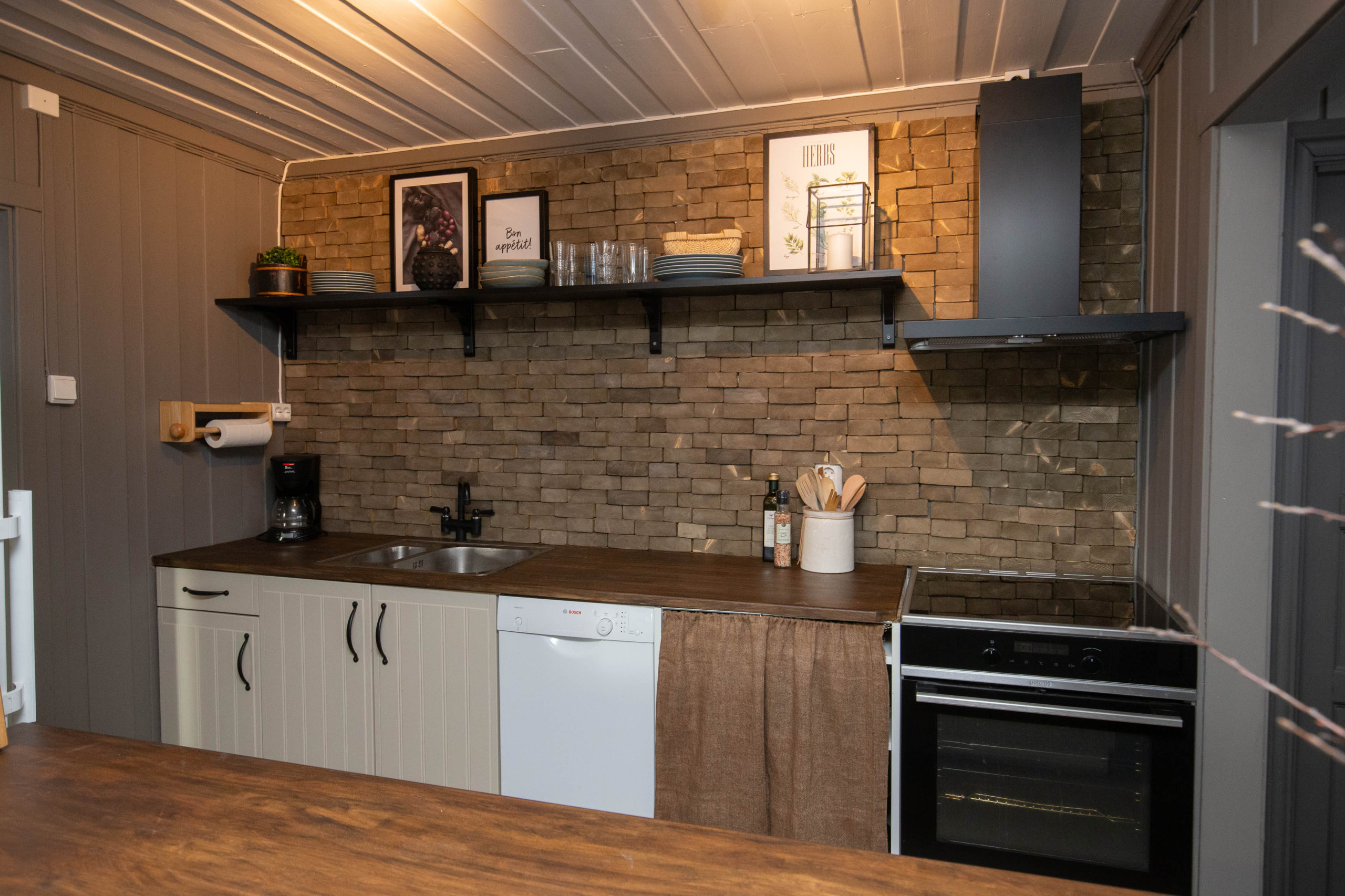 Kitchen equipped with a fridge, oven, dishwasher, coffee machine, and kettle