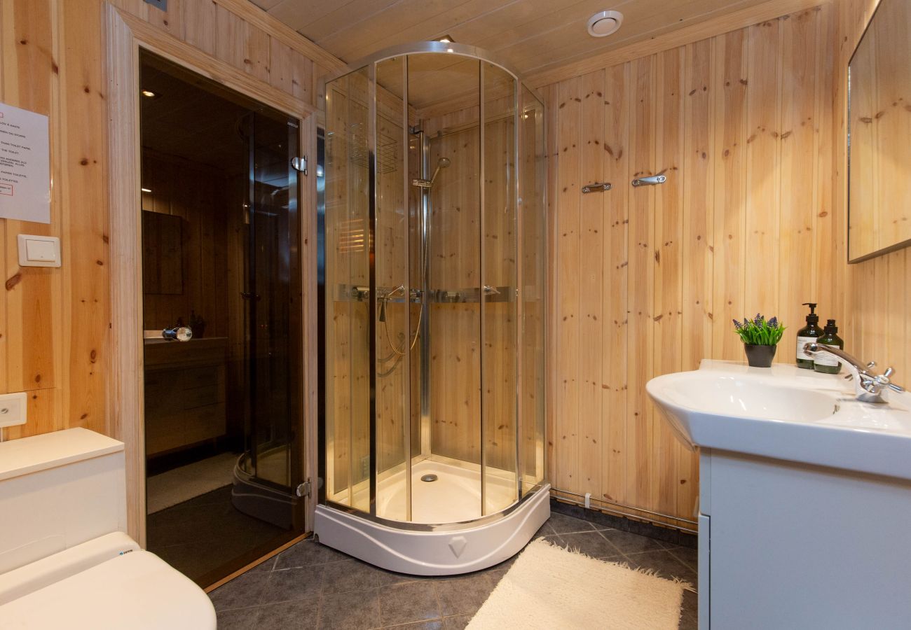 Bathroom with shower and access to a sauna
