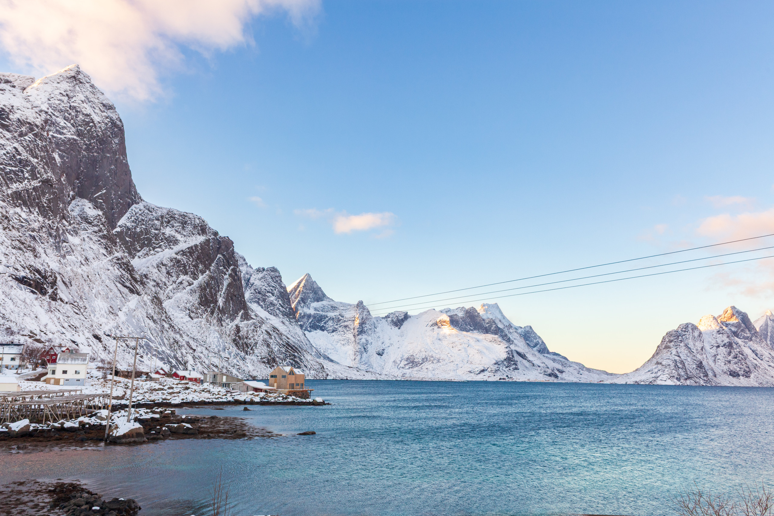The house is surrounded by stunning natural beauty in the enchanting village of Reine, offering proximity to and breathtaking views of the sea and mountain ranges. The property is situated on the front row facing Reinefjorden.
