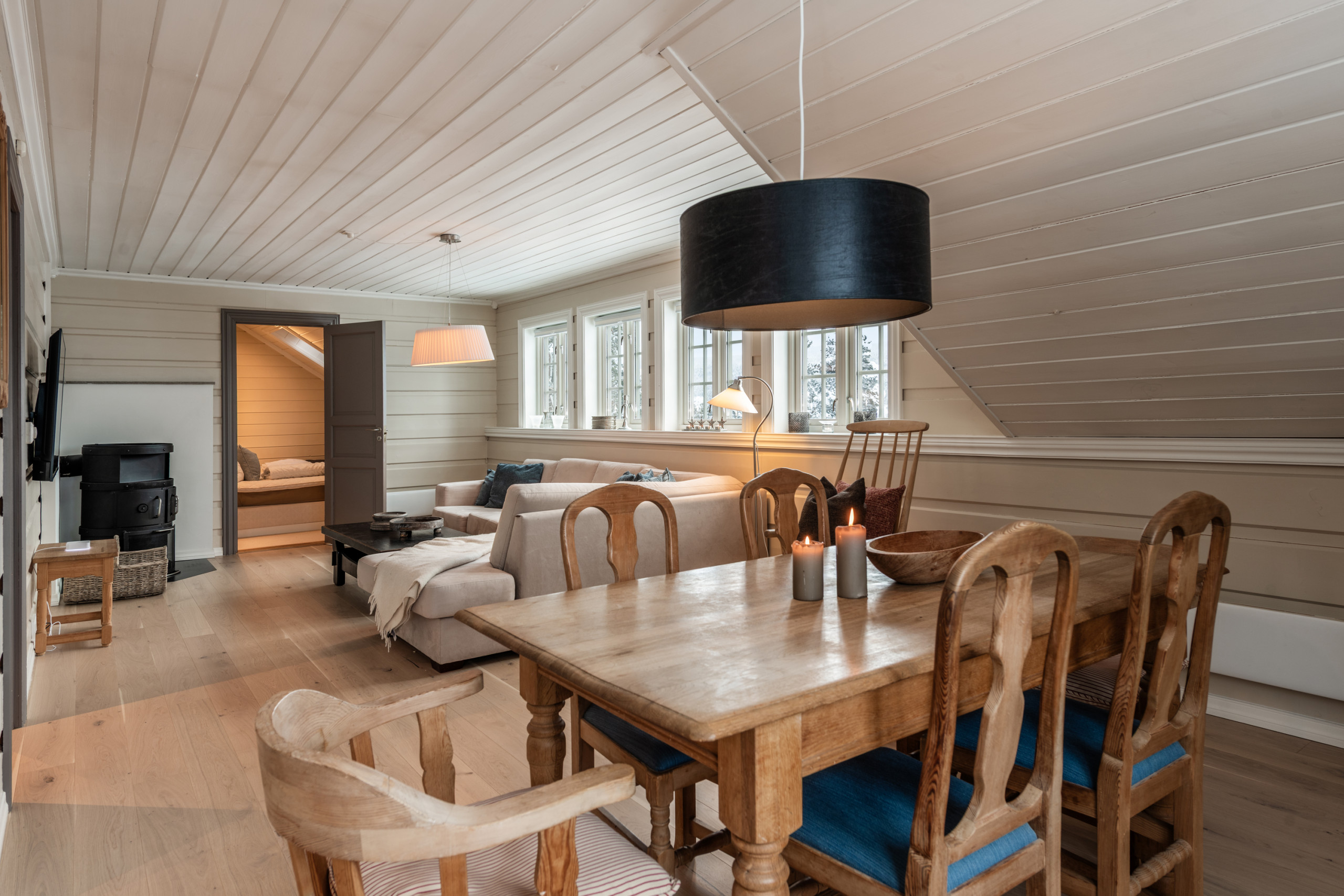 Denne flotte hytta ligger sentralt på Geilo. Med fem soverom – tre med dobbeltsenger, ett med to enkeltsenger og ett med køyeseng– er det rikelig med plass for hele familien eller vennegjengen. Hytta har to flislagte bad og to kjøkken, perfekt for å lage den maten som trengs. 🍽️