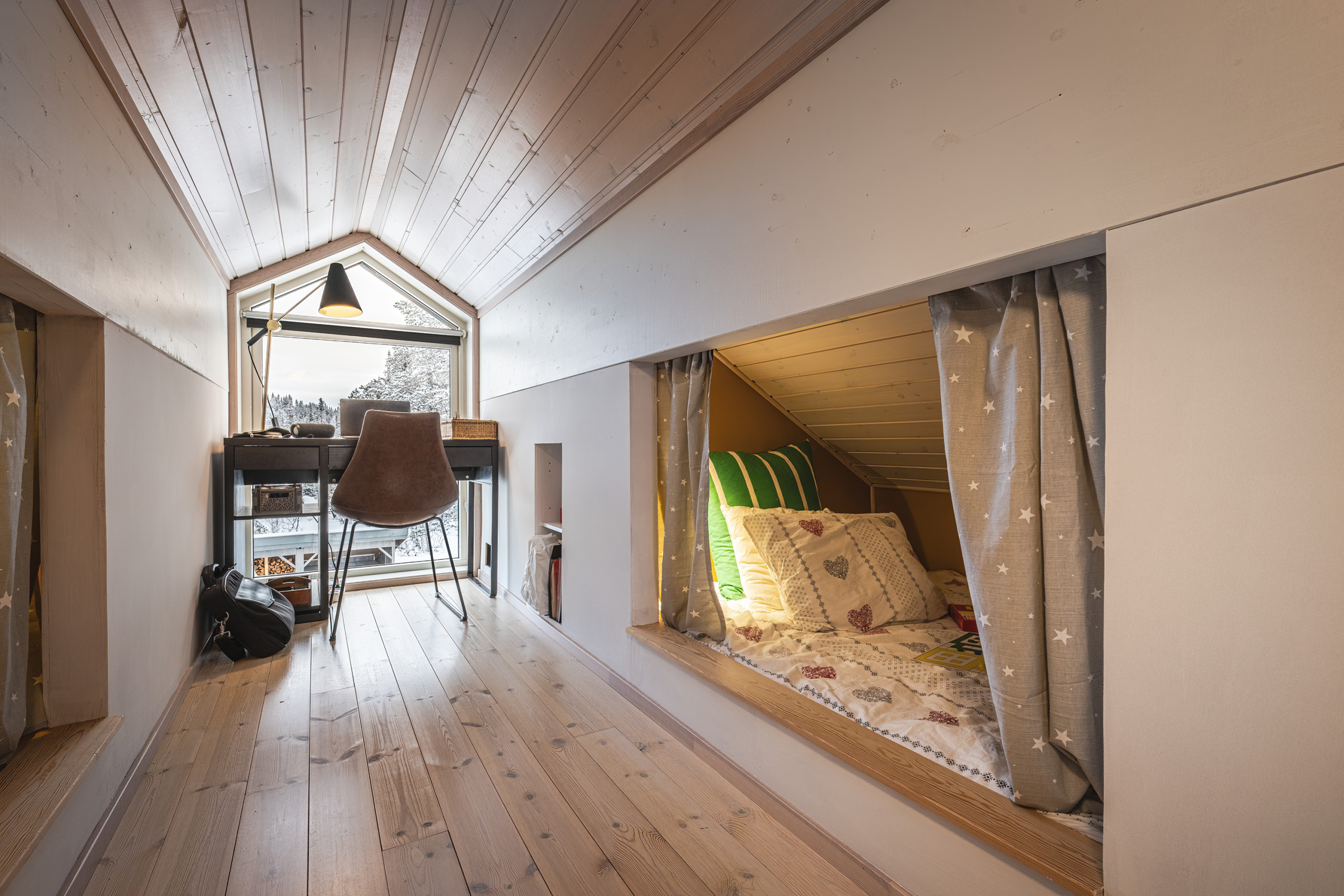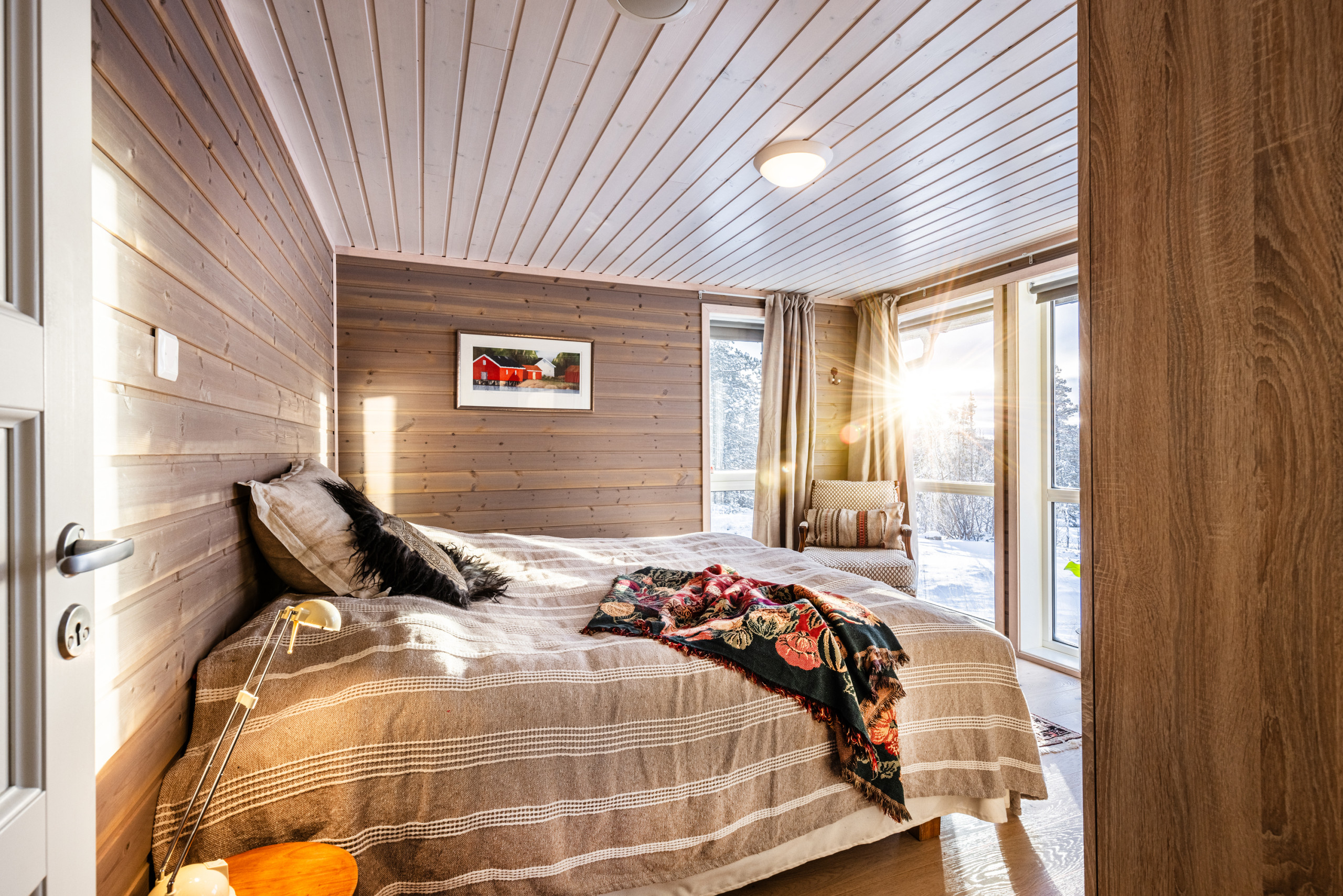 -Ett soverom med dobbeltseng 150x200 cm og to enkeltsenger på hemsen.