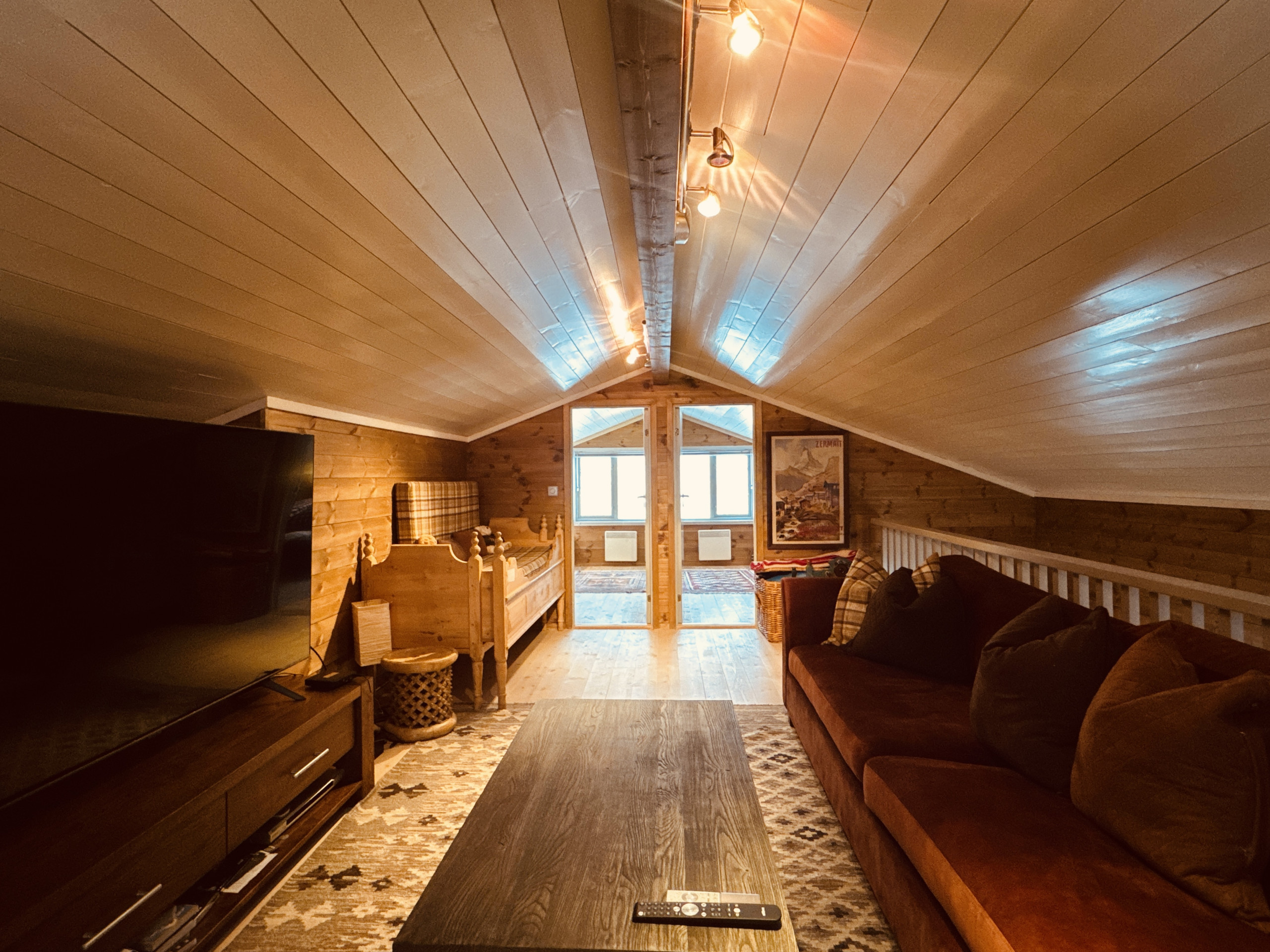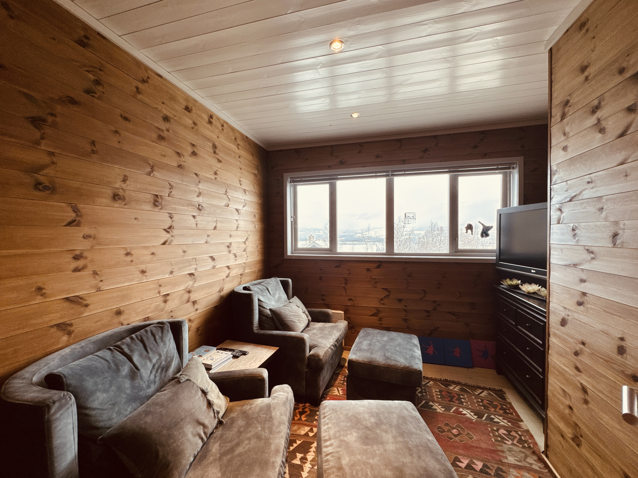 To TV-soner (nede/oppe), Smart-TV, Chromecast og Netflix. Brettspill og bøker tilgjengelig. Persienner i stue, leselamper og strømuttak ved senger. Terrasse med utemøbler. Bålpanne (ved kan bestilles).