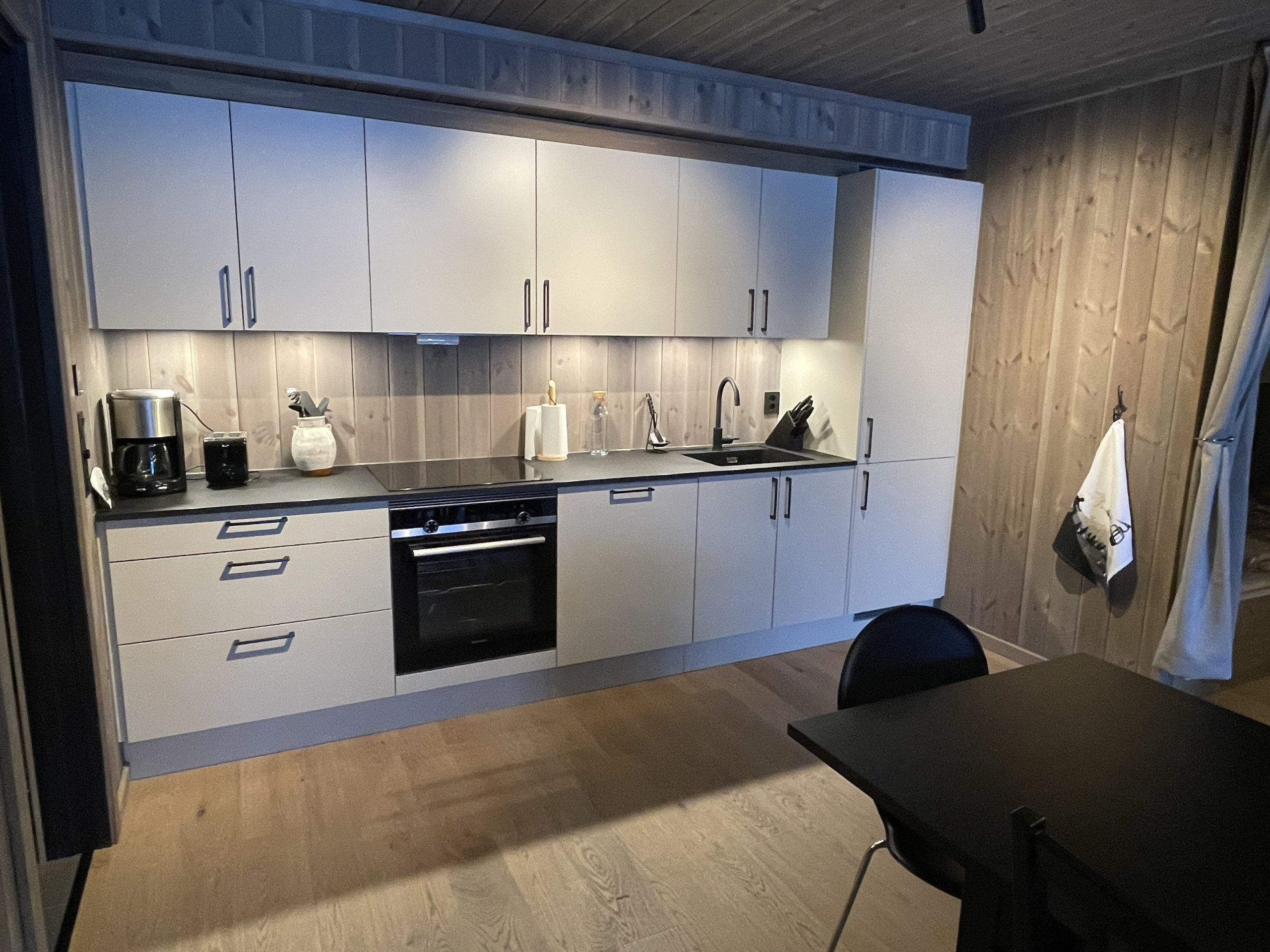 Det åpne kjøkkenet er fullt utstyrt med moderne, integrerte apparater som induksjonstopp, kjøleskap, mikrobølgeovn, ovn, oppvaskmaskin, samt alt nødvendig kjøkkenutstyr, servise, kaffetraktere og vannkoker. Leiligheten ble nylig ferdigstilt og møblert.