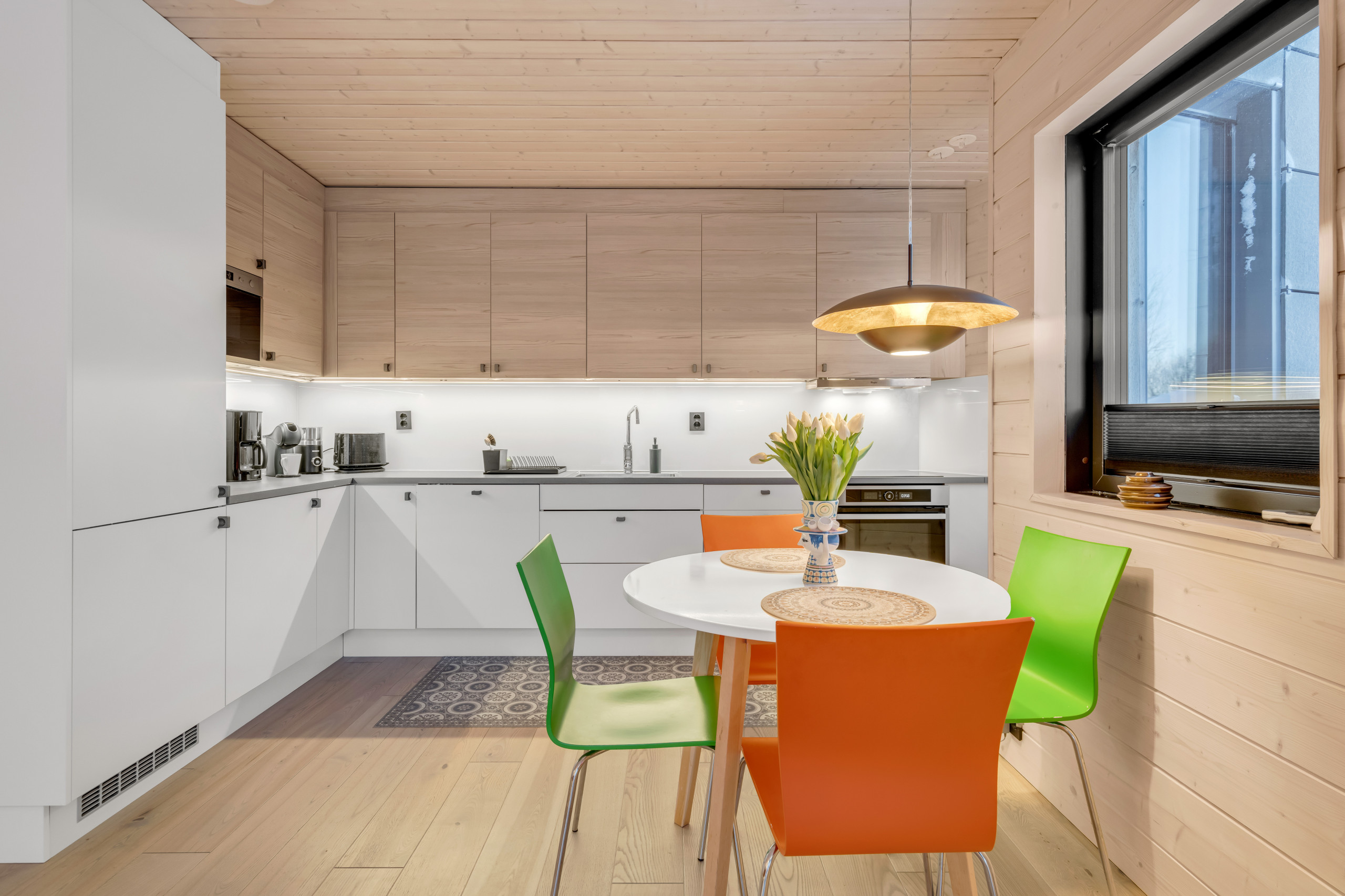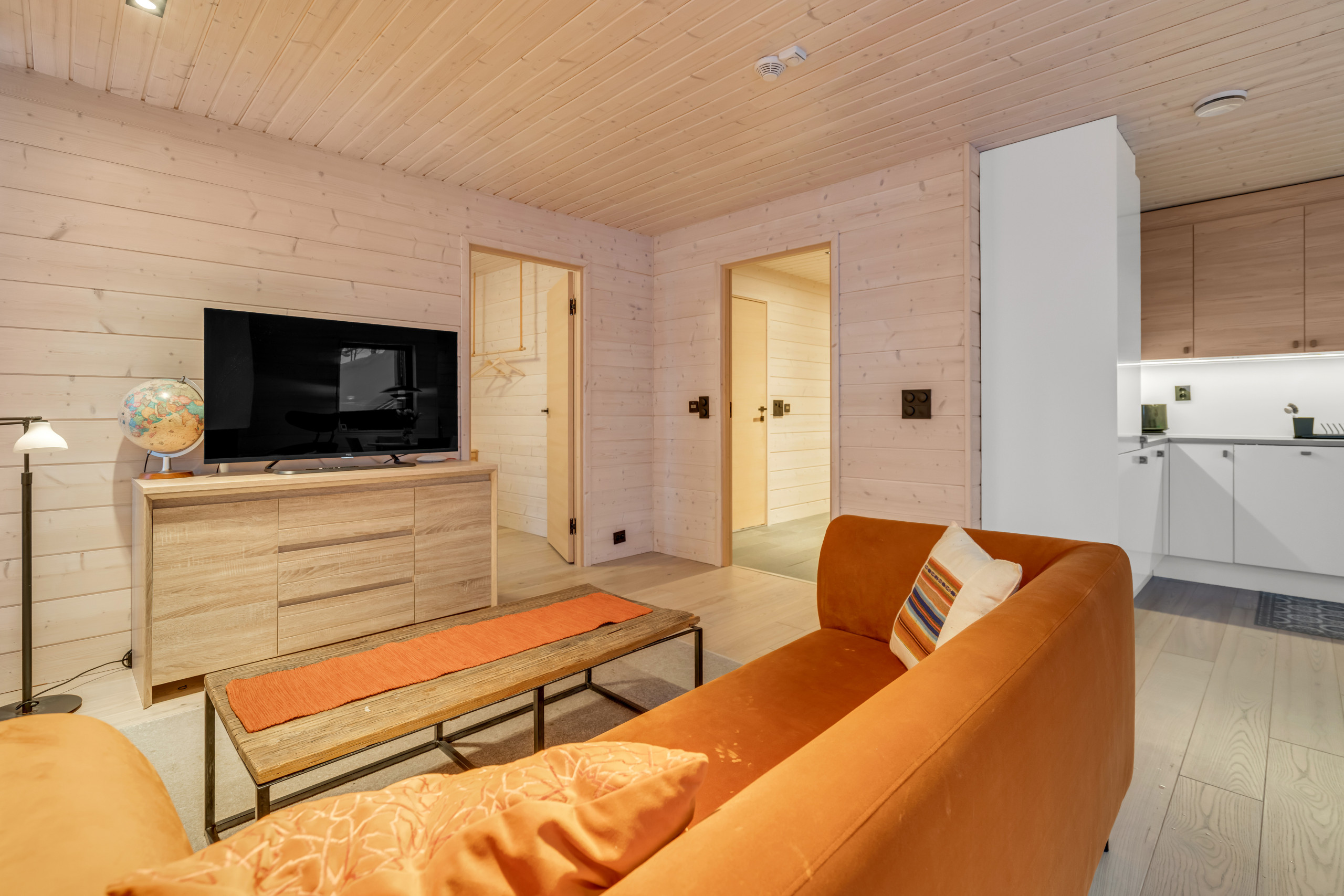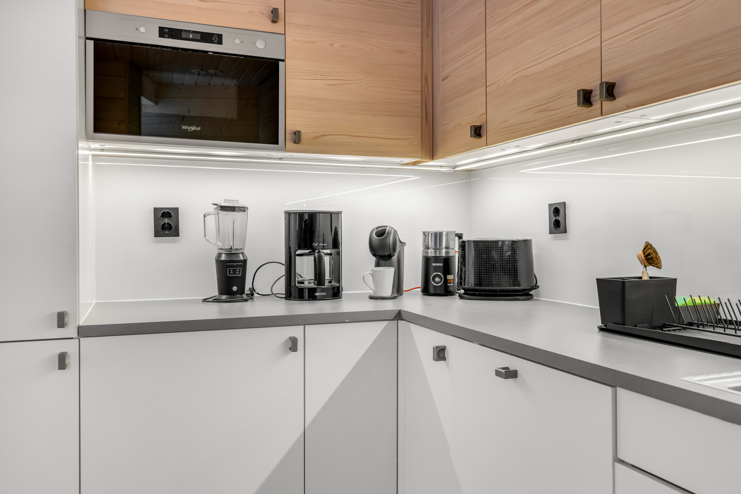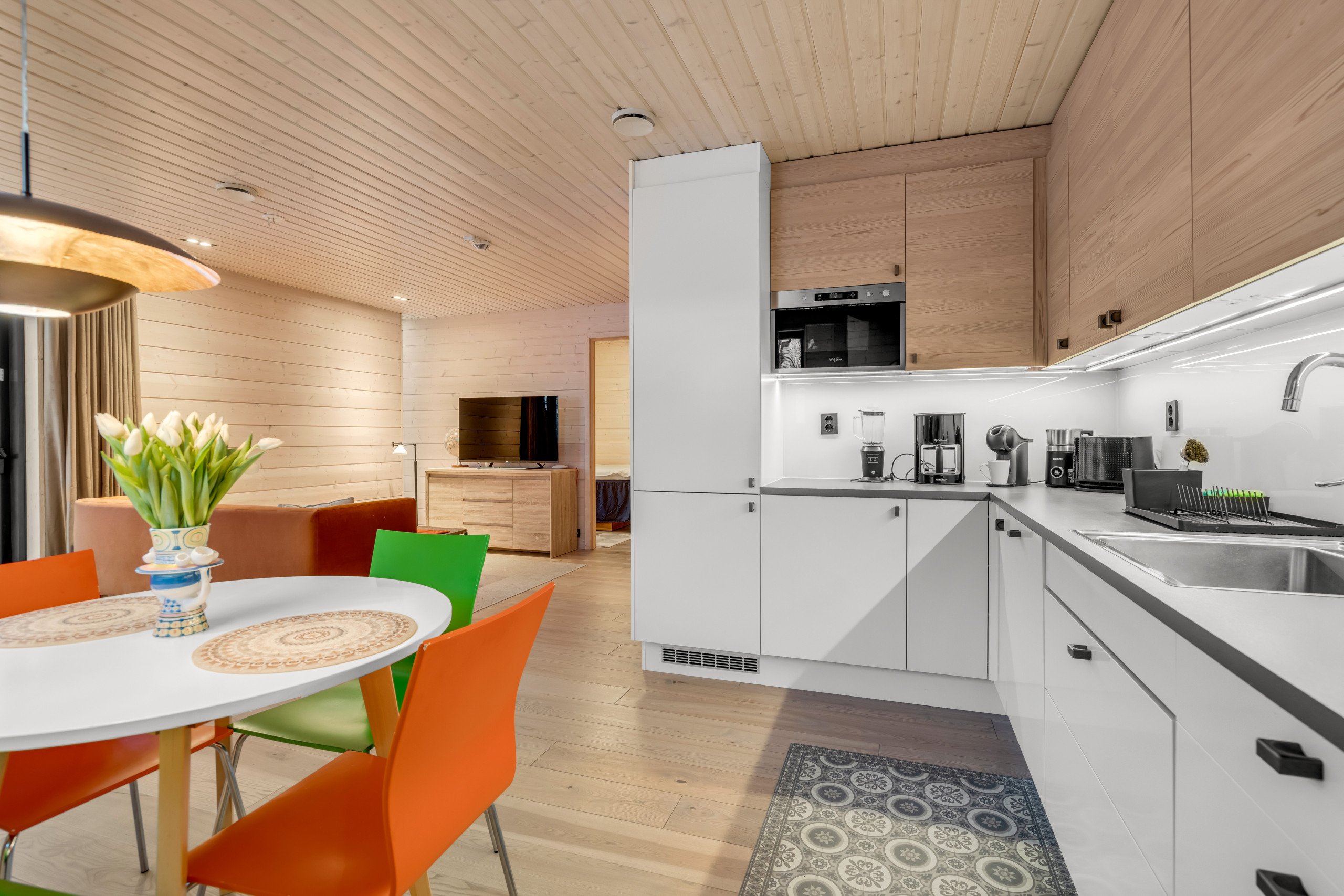 Det stilige åpne kjøkkenet er fullt utstyrt med en induksjontopp, kjøleskap, ovn, oppvaskmaskin, kaffemmaskin, vannkoker, service og kjøkkenutstyr - alt du trenger for å nyte et romantisk måltid hjemme etter en dag med arktisk eventyr.