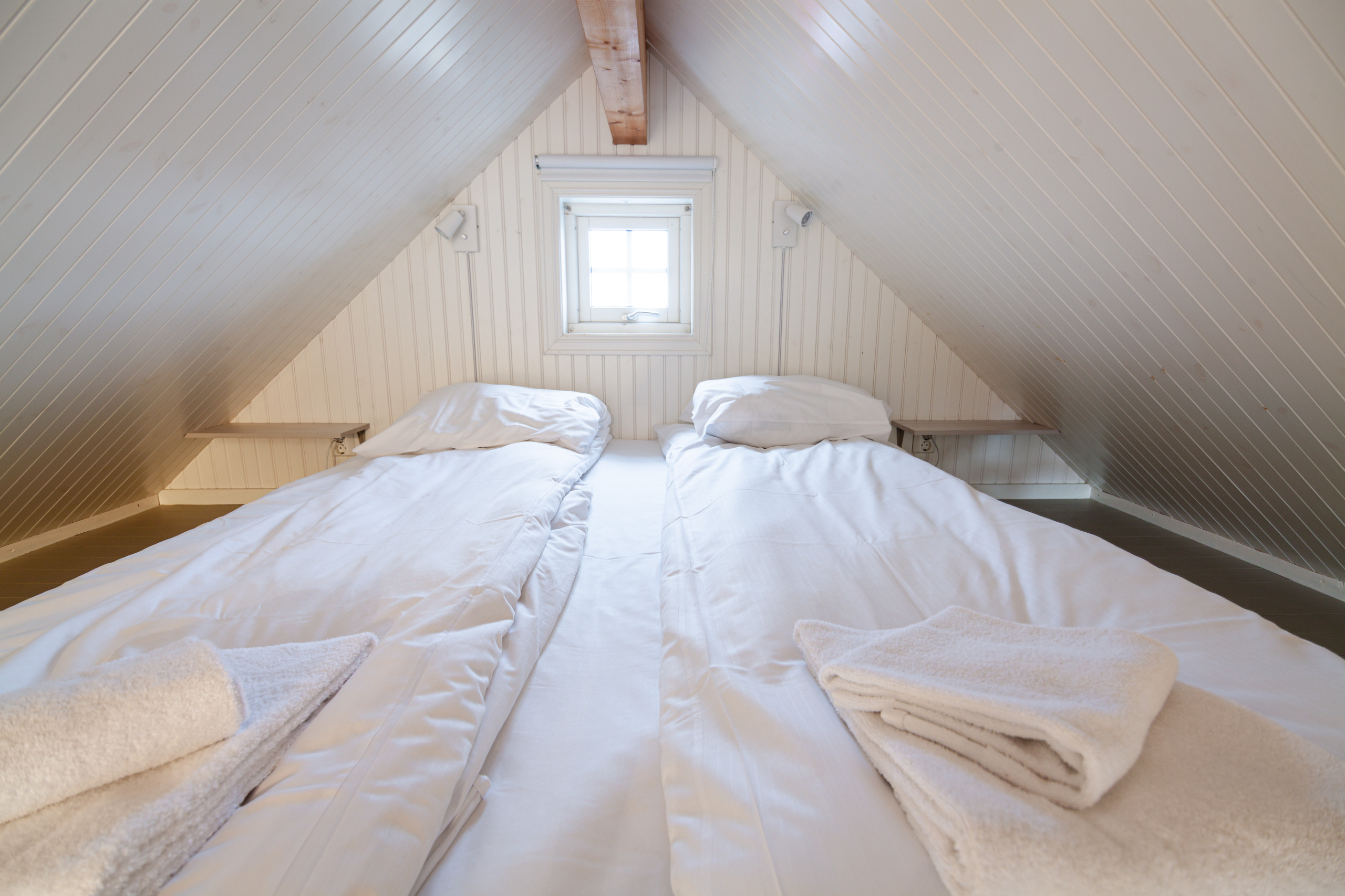 Hovedsoverommet er på en mezzanin, det har en dobbeltseng, et vindu som kan åpnes og utsikt til fjellene bak huset. Men fra samme seng har du også en spektakulær utsikt ut mot havet.