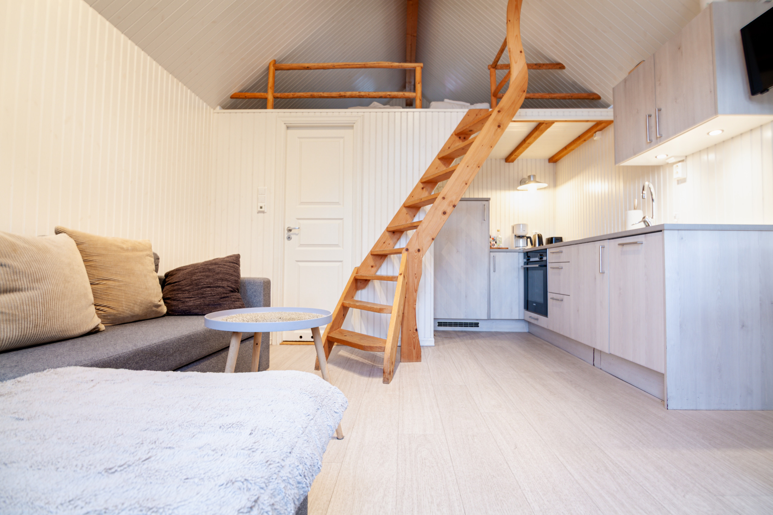 Huset består av 2 rom: stue/soverom/kjøkken, og et bad. Huset har 1,5 etasjer med en dobbeltseng i loftet, som fungerer som hovedsoverommet. Det er et vindu som kan åpnes med utsikt over fjellene bak, men du har også en fantastisk utsikt over havet fra dobbelsengen der oppe. Huset føles veldig luftig og behagelig med sin nesten 4 meter høye takhøyde i stuen. Badet er lite, men praktisk og elegant. Kjøkkenet er utstyrt for 4 personer, med et under-benk kjøleskap, en kokeplate med 2 induksjonsplater og en oppvaskmaskin. Det er kun en kokeplate på kjøkkenet, ingen ovn.