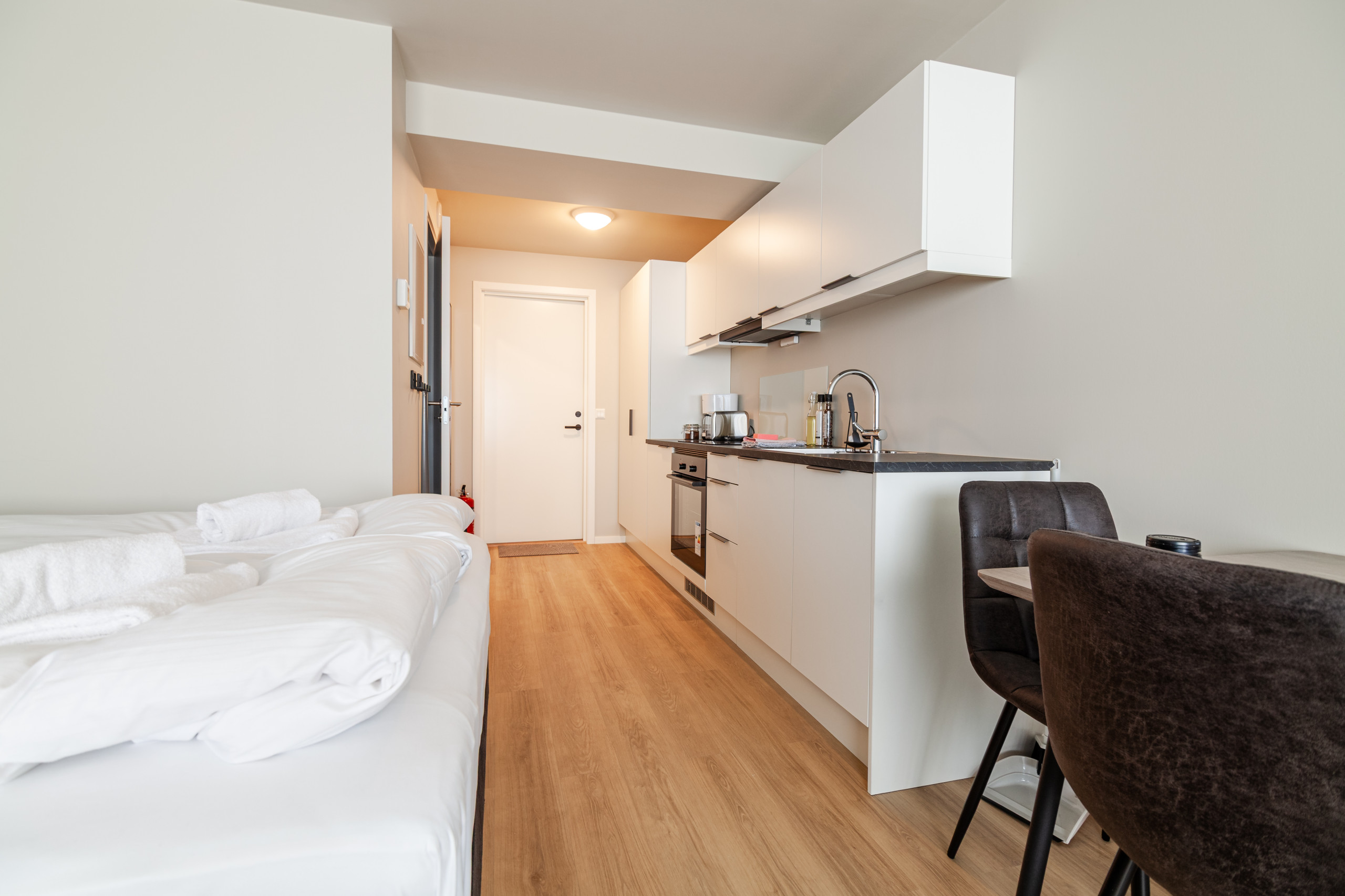 Dette studioet er utstyrt med alle bekvemmeligheter du trenger for et kort opphold eller en lengre periode. TV og gratis WiFi. I gangen har vi et felles vaskeri med vaskemaskin og tørketrommel.